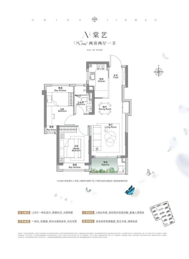 建面约105㎡3房2厅2卫,做到了三开间朝南+4个飘窗+双面阳台系统+主卧套房设计+270°转角飘窗,该户型的居住体验、舒适度、尺度感,是同级别产品所无法比拟的。