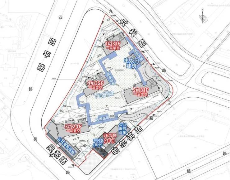 4栋住宅一层全部为架空,入口至楼栋间设置有风雨连廊。
