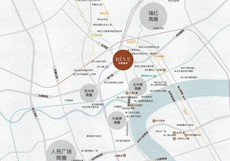 商圈叠加:南京东路-外滩商圈、人民广场商圈、苏河湾商圈、北外滩商圈、瑞虹商圈环绕叠加