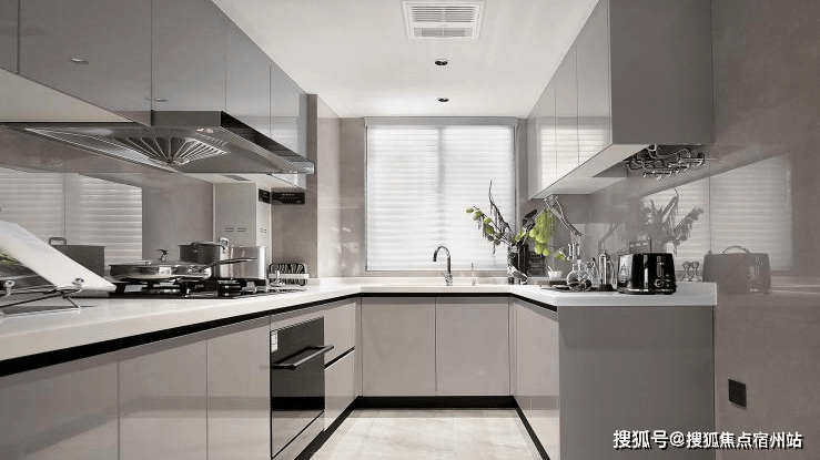 厨房空间,采用铝合金玻璃PVC饰面的免漆门套及铝合金移门,三件套使用老板的油烟机、燃气灶、洗碗机交付,更有摩恩的水槽和龙头、定制的组合橱柜。