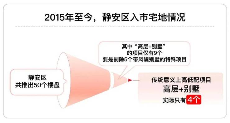 自2015年至今,静安全区累计推出约50个楼盘,其中“高层+别墅”规划的项目仅9个;若剔除5个风貌保项目,传统高低配产品,其实只有4个。
