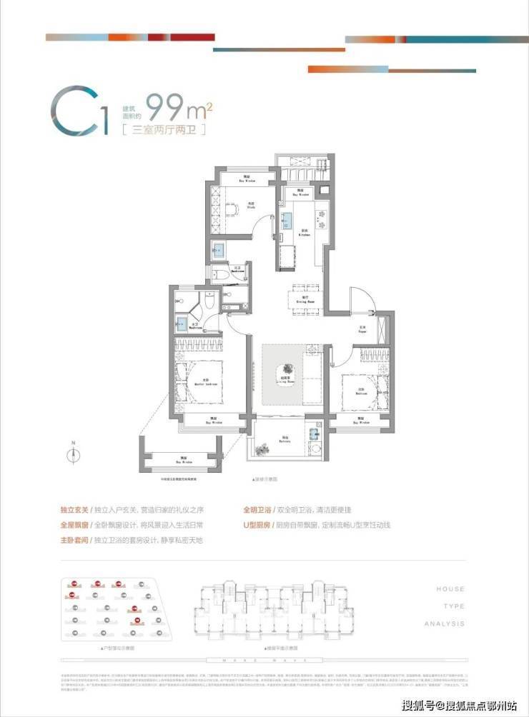 建面约89㎡三房,三开间朝南+双飘窗设计,U型厨房与干湿分离卫浴兼顾功能与美学;