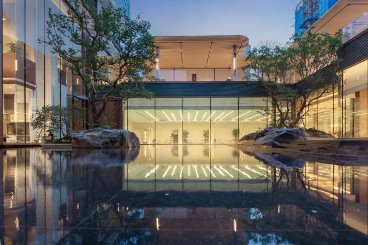穿过门庭,看到名为“归心之境”的入口内院,方圆廊架如同天地画框,将枫树、奇石、叠水巧妙收纳,勾勒出“天人合一”的至臻画卷。