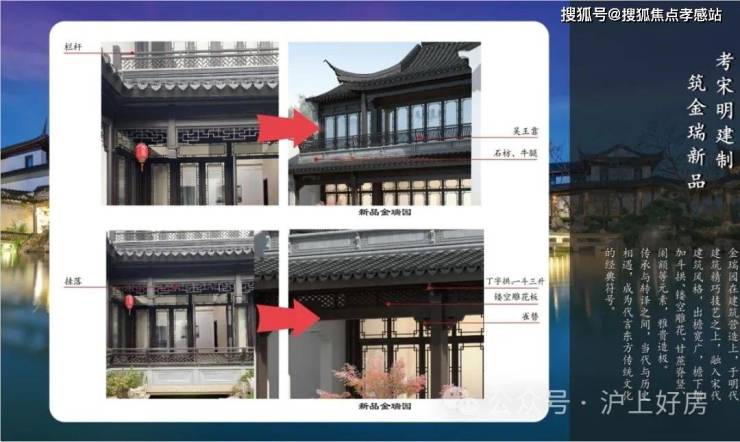 同时,建筑采用宋代宫殿, 建筑出檐宽广,檐下增加斗拱、镂空雕花、甘蔗脊、阑额等元素,约2/3宅园设置入户连廊,为全国之最,雅贵造极。