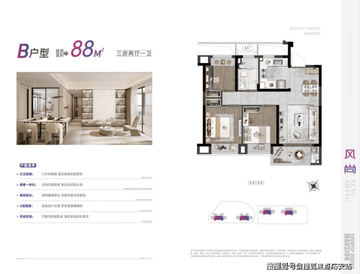 深嘉上府以88-99㎡的明星爆款小户型,圆年轻人的置业梦想。其中,88㎡户型以三房两厅一卫的格局,兼具功能性与尺度感。南向三开间,做到两间卧室朝南,这样的面宽,媲美市面上100㎡户型的新房尺度。u字形的厨房,动线合理。餐厅空间,能够从容摆放一张四人大餐桌。全屋飘窗设计,将赠送空间拉满。