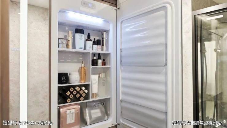 卫浴空间同样精彩,采用高仪的台盆、龙头、智能马桶、淋浴花洒等,主卫创新定制“美妆冰箱”,满足业主对美妆、护肤用品冷藏的需求,足见开发商对成本的舍得。