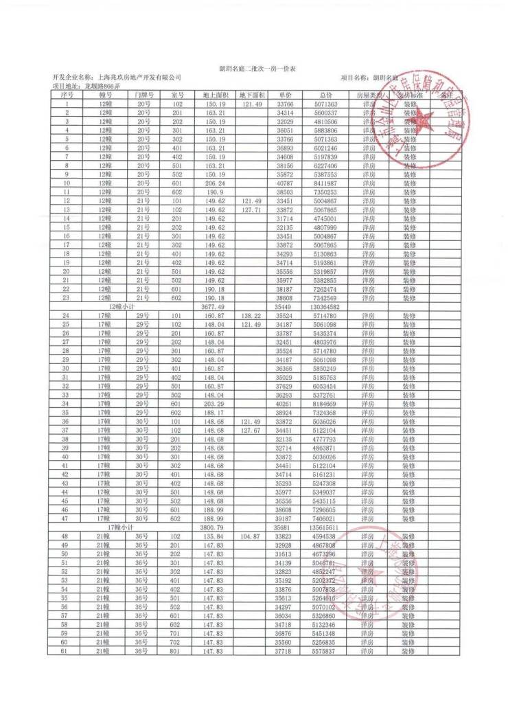 项目一房一价表
