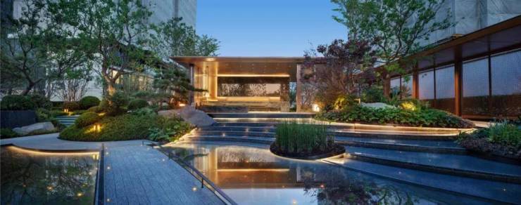 而大华星曜预约热线☎:400-8080-420✅✅不仅打造了具有曲线美感的树池,还在水景底部铺了数百片蓝钻瓷片,全角度弧形定制,水刀切割,用金属线条勾勒出水波的形状。