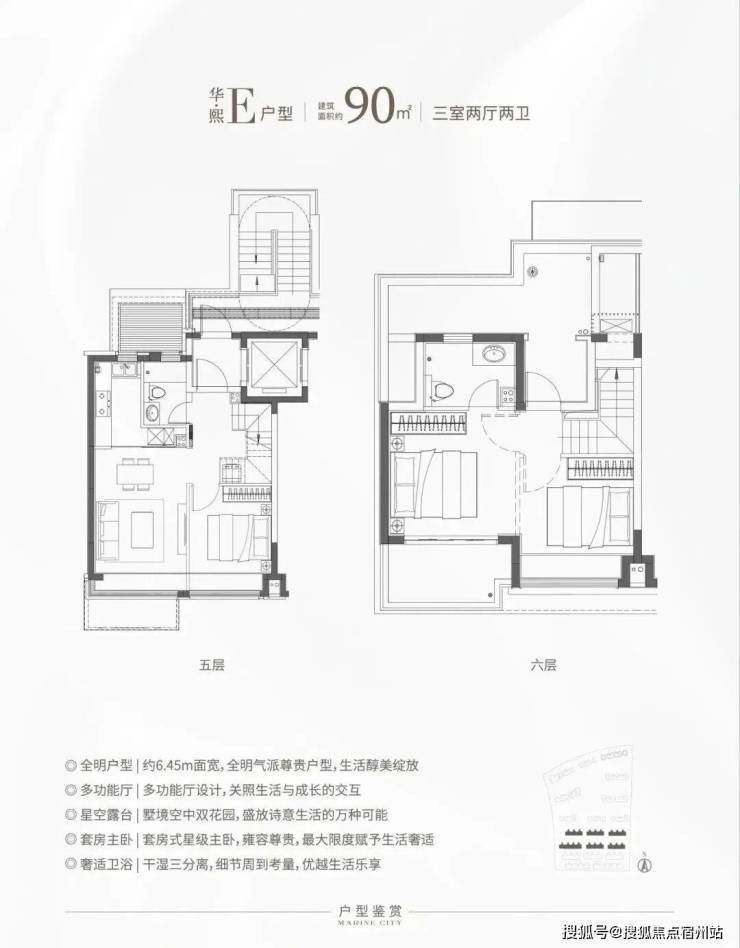 特别是这个E户型,建面仅约90㎡,对于想住叠加但预算有限的购房者来说,面宽约6.45米,上下动静分离带,是个不错的选择!