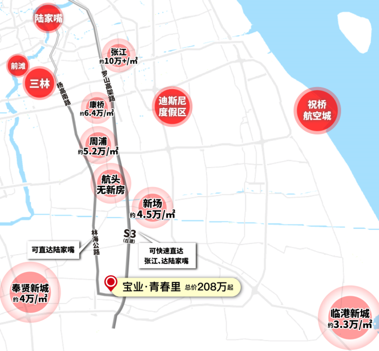 从张江沿着S3(在建)一路南下,张江的房价如今已到了“高不可攀”的程度。
