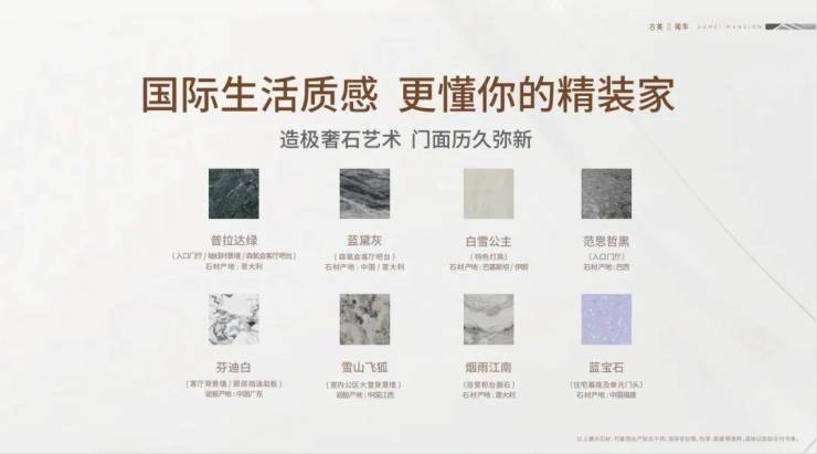 古美阅华在装修上使用大量奢石元素,凸显尊贵的艺术格调比如客厅背景墙、厨房挡油板选用了芬迪白岩板,浴室柜台选用了原产地为意大利的烟雨江南石材。