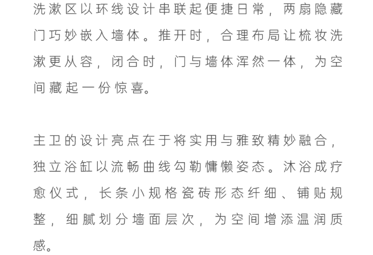 一般而言,主卫和次卫能拥有窗户达到全明采光已经称得上优秀了,而这套户型的两个卫生间均都有飘窗,丰富更多收纳可能性。