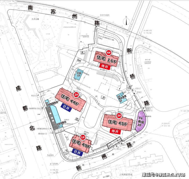 1#地块:分为南北两块:南块,东至新桥路,南至新闸路,西至成都北路,北至成都北路1012弄;北块,东至新桥路,南至新桥路51弄,西至九子公园,北至南苏州路。未来主力产品为超高层住宅。