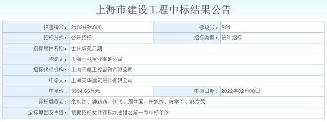 2022年2月8日,上海天华建筑设计有限公司以3994.65万元中标士林华苑二期地块设计项目!