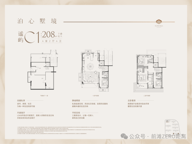 下叠户型,一楼南向大横厅约9.3米的南向面宽,配合约3.3米的层高,营造出开阔的空间感;