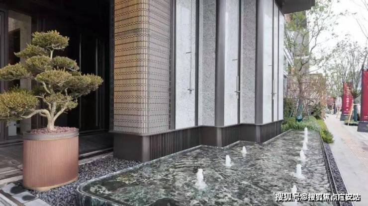 酒店式落客门庭很有气势,采用定制化拼花铺装,同时在两侧打造了静谧的水景,与对面的桃浦中央绿地相呼应。