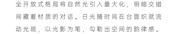 全开放式设计,岛形沙发打破边界,让交流随光影自由发生。午后的光线从侧面洒落,家具被赋予立体的光影层次。