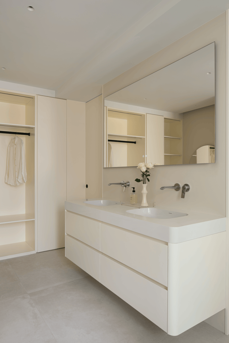 作为入户第一幕,玄关以极简姿态开启生活叙事,素净墙面如天然画布。清透支架托举着素白花瓶,植物姿态俏皮延展,成为连接户外与生活的温柔过渡。