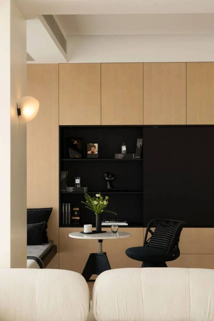 中央的B&B Camaleonda模块组合沙发,以岛状布局重构空间逻辑,双向陈设的低椅背设计。一面朝向书柜电视墙,一面衔接餐厨区。让场景切换随心意而生,既保持空间通透感,又以功能分区提升使用效率。