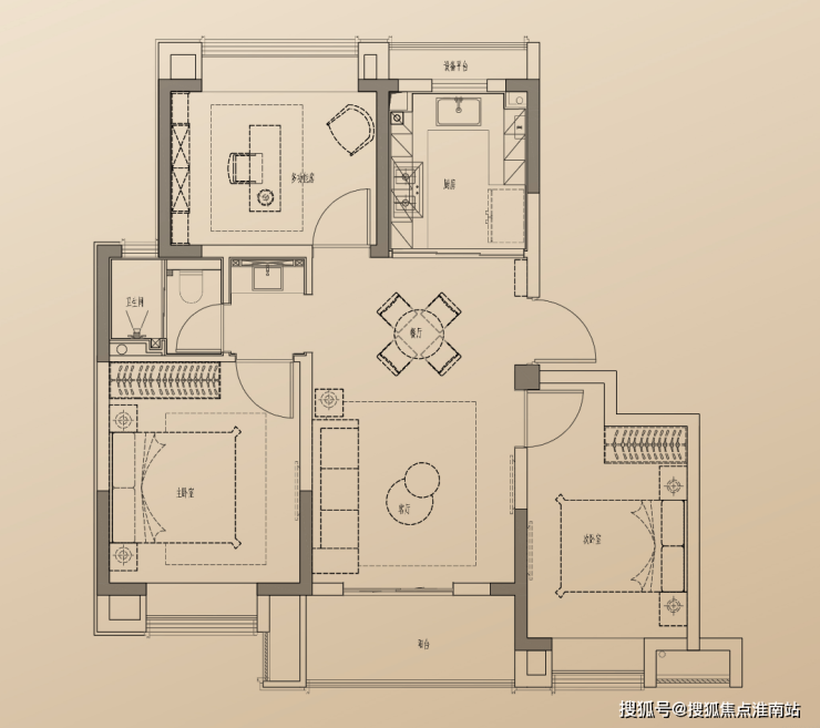建面约100㎡3房2厅2卫,做到了同面积段中少有的横厅+大阳台设计,餐厅、客厅、阳台一脉相连,居住尺度不断向外延伸。无论日常的休憩、玩乐亦或者是会谈来客,宴请朋友都显得从容大方。