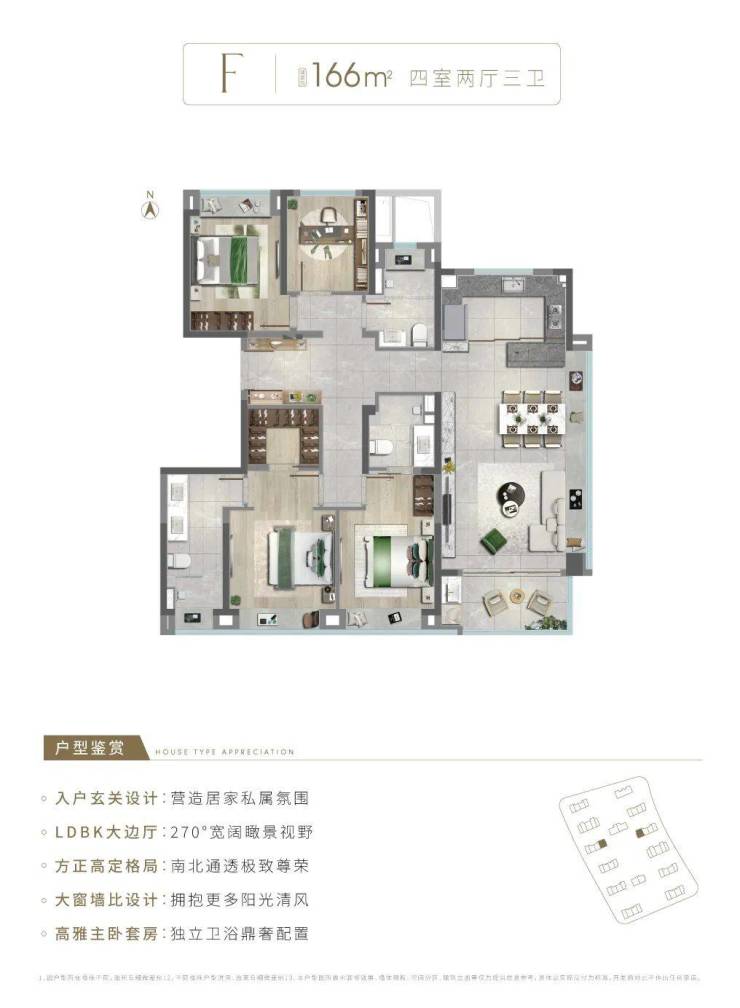 建面约166㎡4房2厅3卫,做到了3+1开间朝南+双套房设计+卫生间干湿分离,是“一步到位”的进阶改善4房!