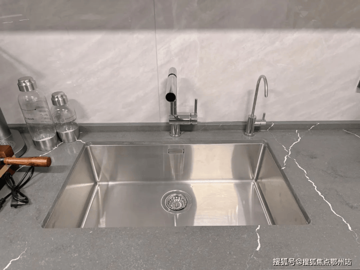 水槽采用的是铂浪高不锈钢大单盆: 配合抽拉式水龙头,轻松洗刷。底下安装了末端净水康丽根或同等品牌。