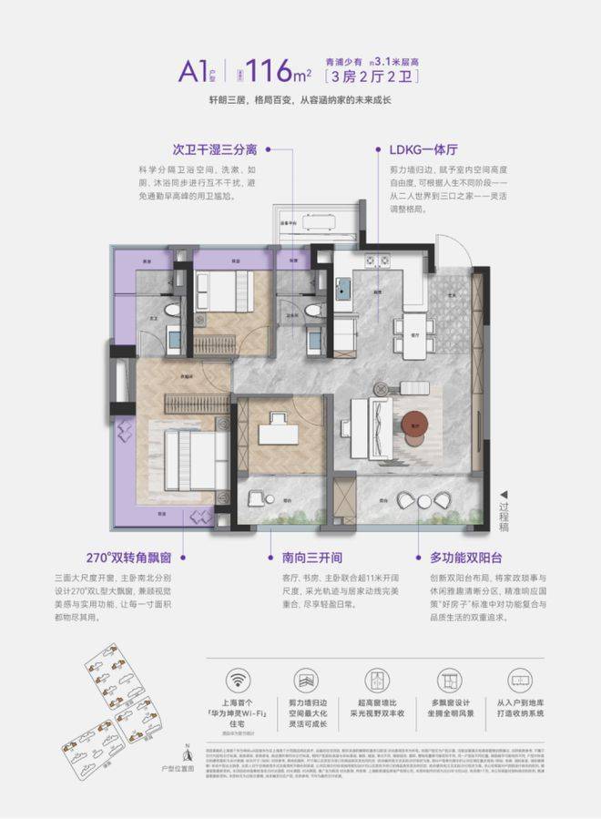第三:全系“生长型”户型,采用“承重墙归边”的革新设计,可以随着人生的不同阶段自由重组。