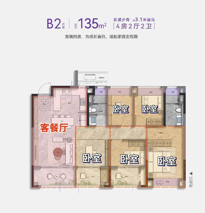 135㎡4+1房户型中,约13.8米的南向四开间,让主卧、次卧、餐客厅,形成了完整的动静分离区。