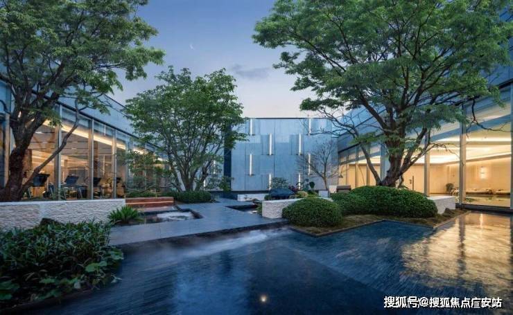 会所还拥有下沉水景庭院,与周围建筑融为一体,以静水、原石、浮桥、古树、自然微地形为精神媒介,将自然与松弛感带给社区。