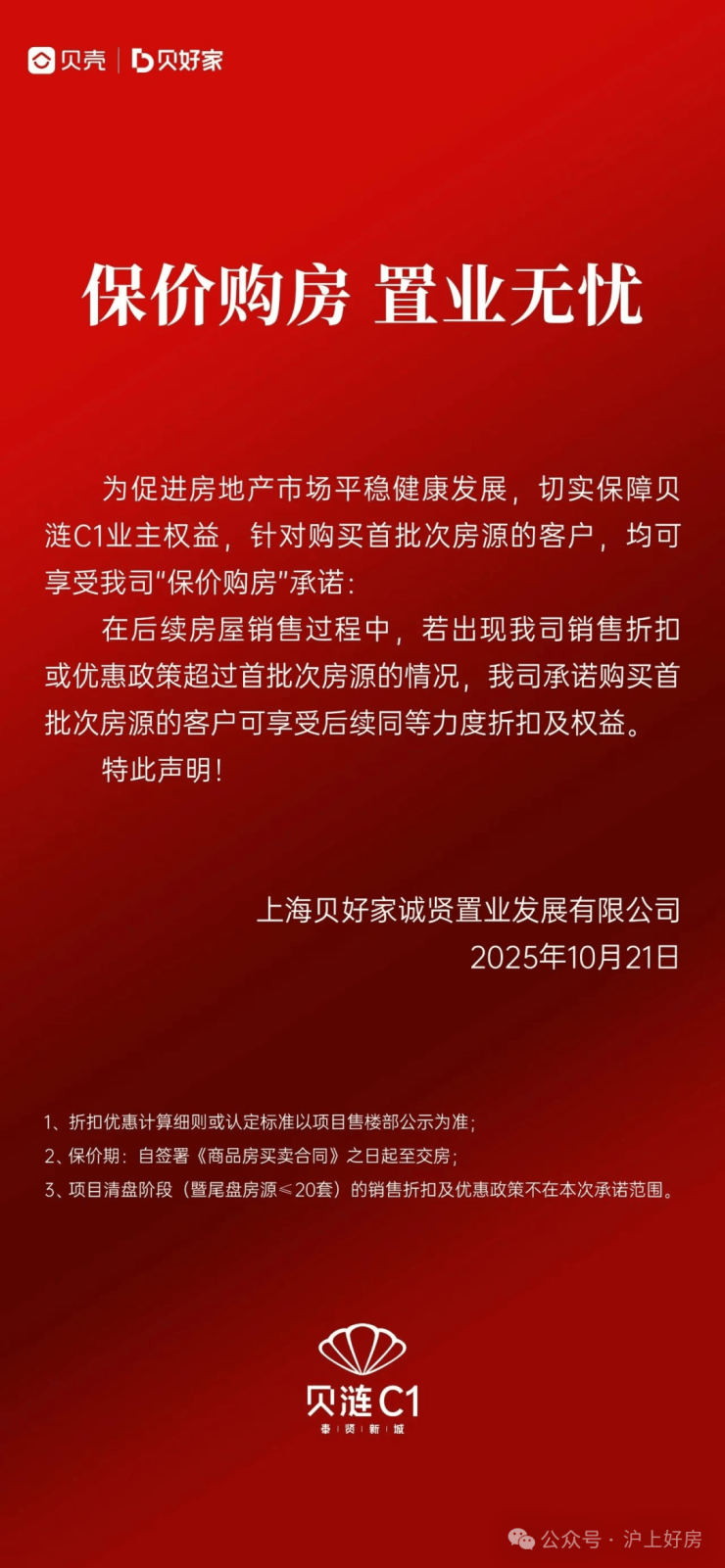 10月21日,贝壳旗下贝好家在上海的首个项目“贝涟C1”发布公告,推出“保价购房”承诺:凡购买首批房源的客户,若后期出现更大力度的销售折扣或优惠,可同步享受同等级别的权益补差。