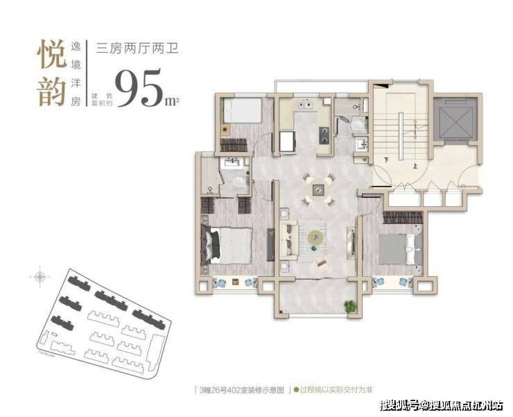 建面约95㎡3房2厅2卫户型