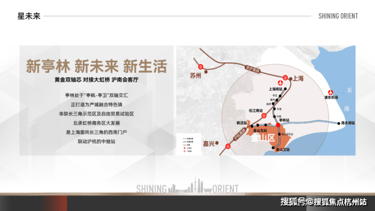 双轨加持 ——距离金山铁路亭林站约2.5km,5站到上海南站,轨交南枫线(规划)串联上海南部客流主动脉