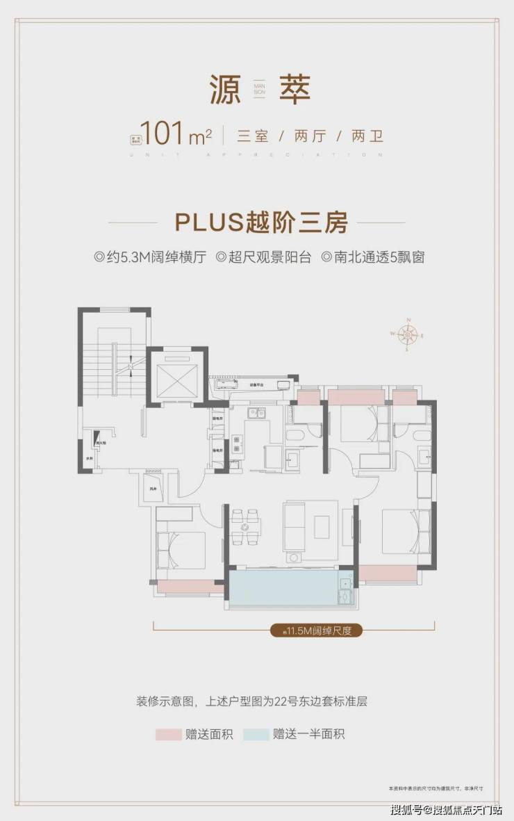 建面约101㎡3房2卫户型,非常标准的飞机户型。