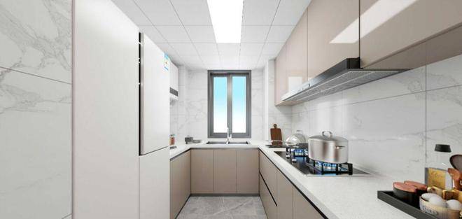 厨房为U型布局,配置定制橱柜、老板烟灶、林内热水器,台面为人造石,水槽为邦克台下盆,细节处体现人性化考量。