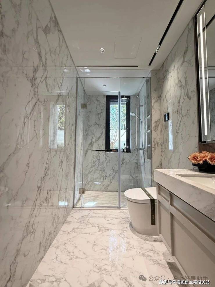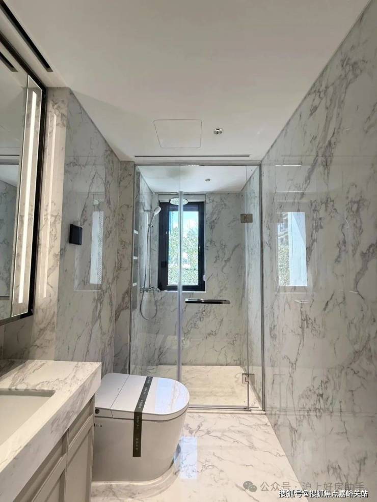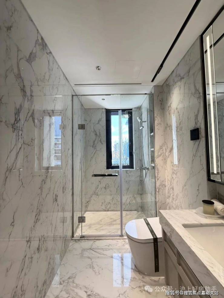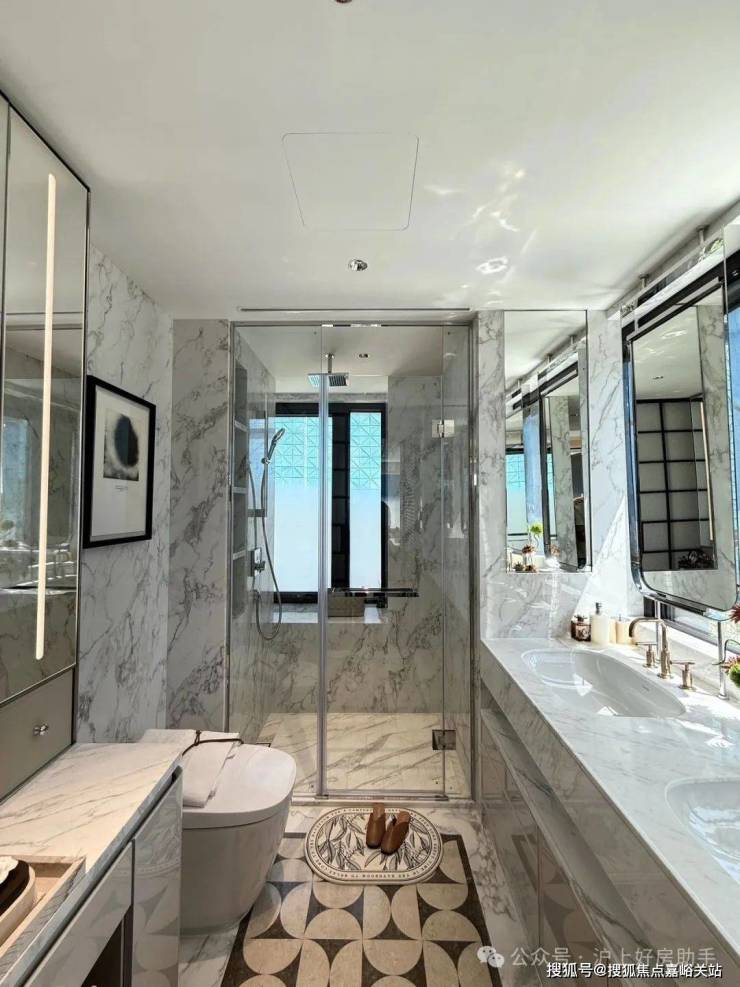 收纳细节上,二期户型中完美继承了一期的收纳系统,玄关收纳,整面内嵌柜体一直延伸到餐边柜;厨房全屋定制的柜体;卫浴的镜面柜和美妆冰箱等等,主卧卫生间的进一步升级:洗手台与化妆台相对,拥有三面镜柜,视觉空间进一步扩展和延伸。