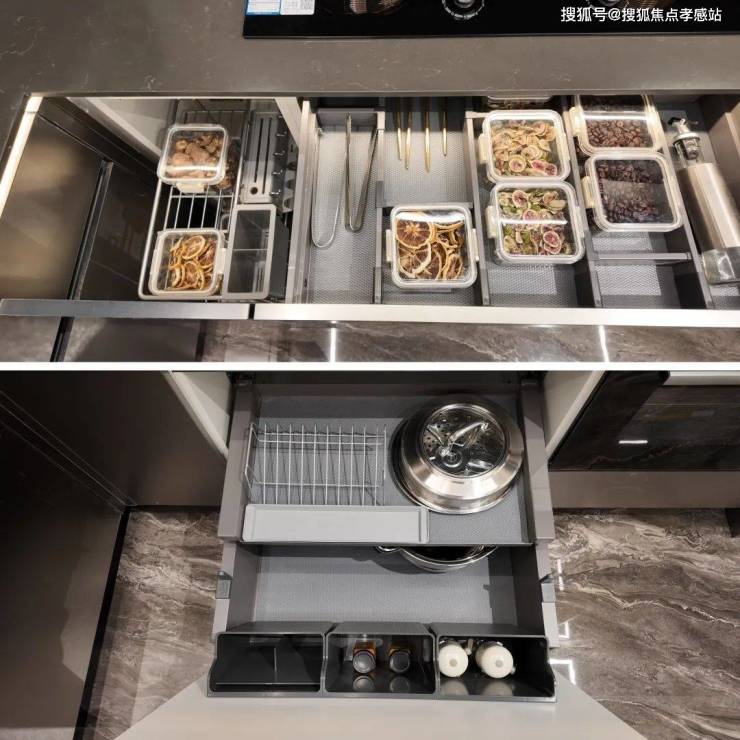 燃气灶下方做好分区的抽屉和轻松抽。「翎翠滨江」售楼处预约热线:400-8855-420📲台面边缘做了一定角度的斜切,这样即便滴水也不会漏至下方的柜体之中。