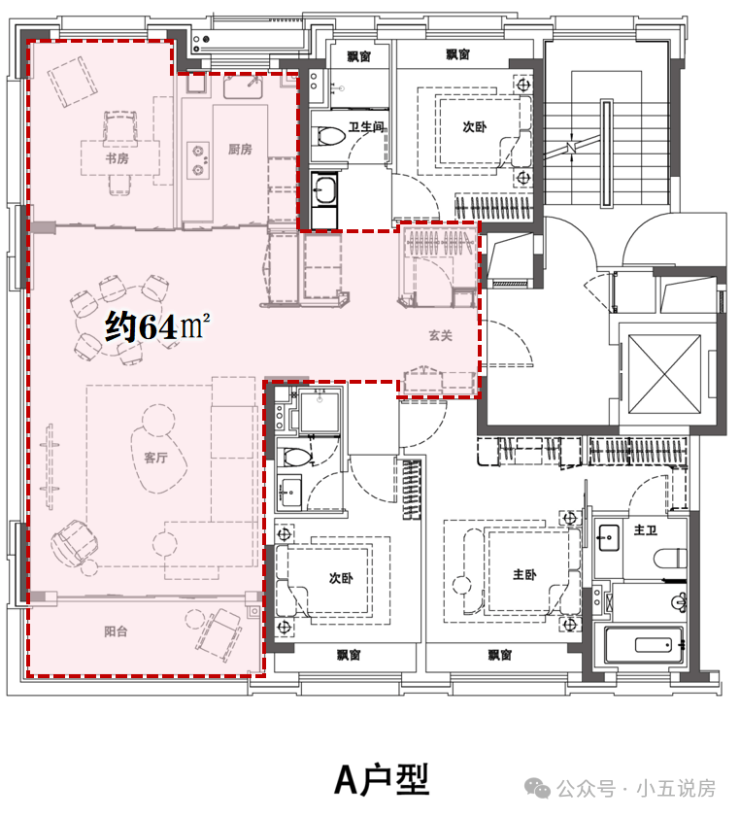 · LDKB一体化公区:客厅、餐厅、厨房、阳台与书房融为一体,形成通透敞亮的整体空间,面积达到了惊人的约64㎡!