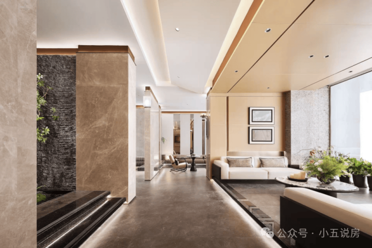 从开启酒店式门扉,到引水入园的奢石对景,再到树影繁花下的水声庭院,