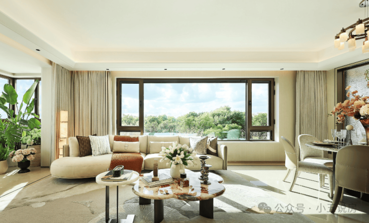 超16米的连续景观面:客厅、餐厅甚至主卧等主要房间都能享受到这一视野,整个家的采光和观景效果极佳。