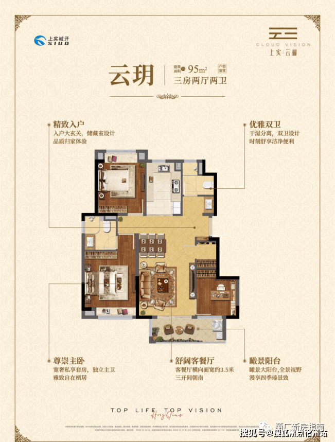 约95㎡三房两厅两卫,做到了 三开间朝南+瞰景大阳台+主卧套房设计+南北通透+卫生间干湿分离 ,该户型得房率和空间利用率都非常高。