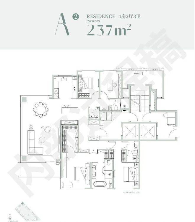 该户型是经典的四叶草布局,四开间分布在四角,兼顾私密与互动,是二胎家庭的优选;