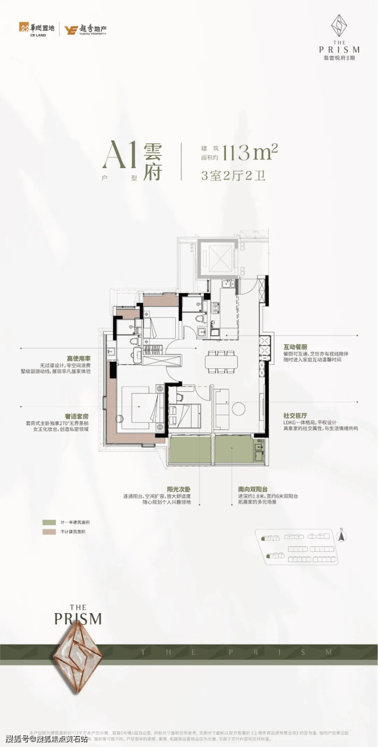 113㎡高层:一梯两户,得房率约 76%,U 型厨房 + 岛台设计,双阳台打通后享 6 米超长横厅,是三口之家的理想之选;