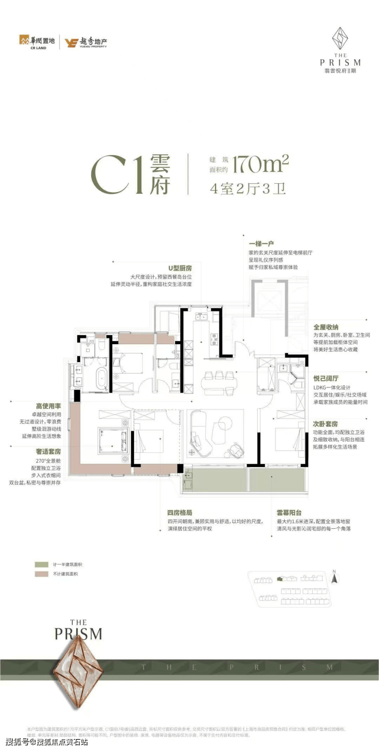 170㎡宽境平层:一梯一户,6.2 米横厅衔接景观阳台,主卧配备步入式衣帽间 + 四分离卫浴,匹配高端改善的奢适需求;
