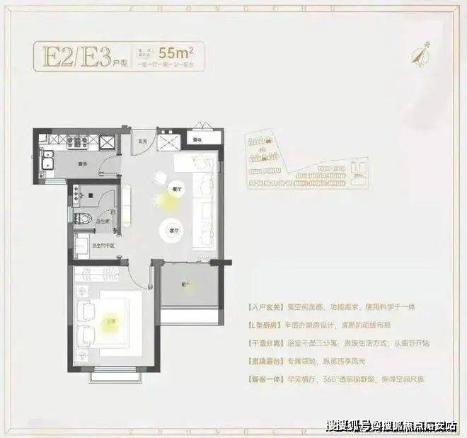 建面约55㎡1房1卫户型,低总价优质上车小户型,做到了双开间朝南+卫生间干湿分离+卧室带飘窗+客餐厅相连,小而美的一个户型。