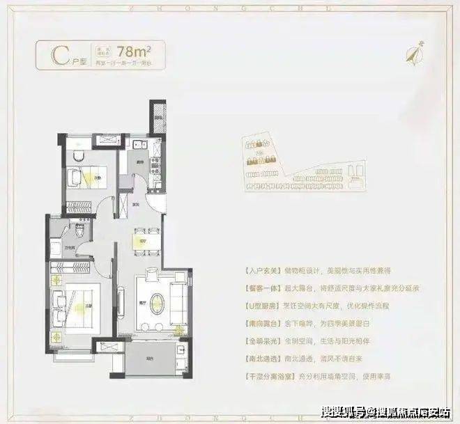 建面约78㎡2房1卫户型,做到了双开间朝南+南北通透+卧室带飘窗+动静分离,功能区划分、动线都非常清晰。