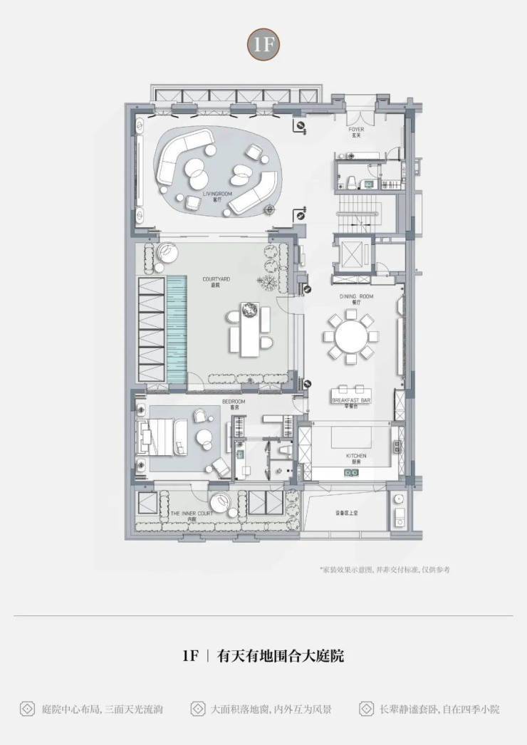 • 庭院中心布局,客厅、餐厅、卧室三面均可采光,内外相映成趣