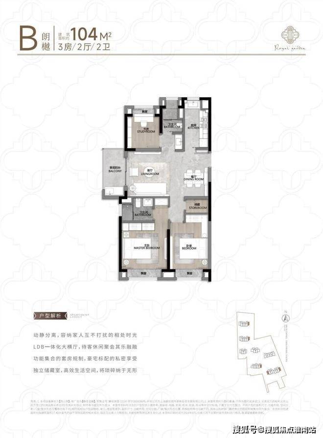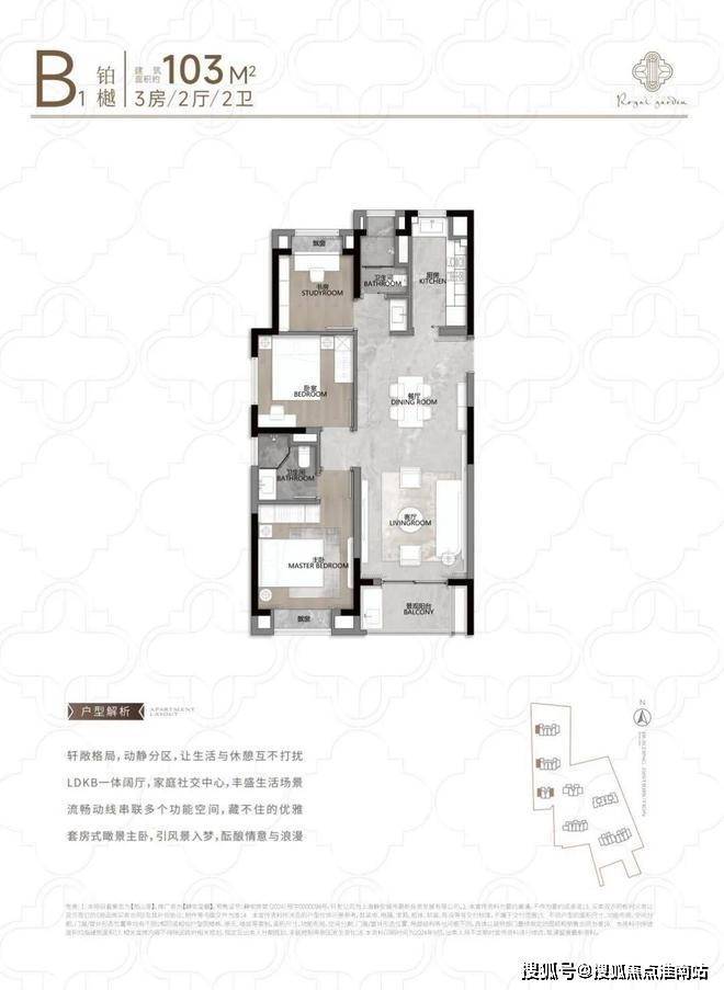 大面宽2+1房灵动户型!双开间大横厅设计宽景阳台,采光面充足!书房灵动空间可以根据家庭需求改变功能;大主卧套房尺度奢阔,隐私性非常不错!次卧出来就是次卫,三口之家居住的话相当于双套房设计,居住舒适度极佳!