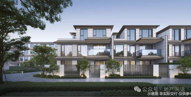 外立面采用银点白麻仿石一体板外墙,联排首层外墙为银点白麻石材,框架线条局部银白色铝板,细部装饰线条为香槟金金属线条,门头局部银点白麻石材及银白、香槟金铝板打造,整体形成典雅尊贵的现代中式建筑意象。