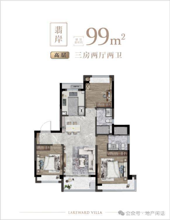 再来看户型,99㎡3 房 2 厅 2 卫 经典的飞机户型,南北通透且全明采光。进门处设计了一个玄关空间,这个玄关位置比较独立,带来很好的回家和出门的仪式感。进来之后是客厅和朝南的次卧,与主卧分隔开,具有良好的私密性。