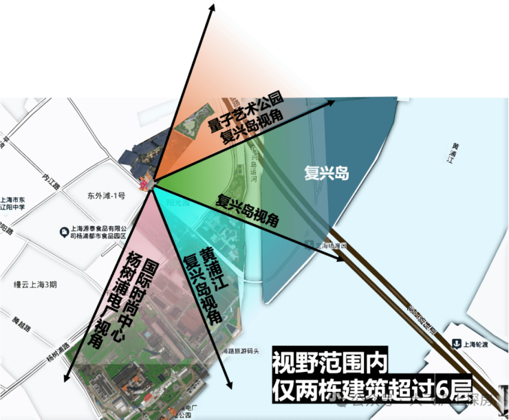 楼典将8号楼的建筑在卫星地图上叠加分析了一下,8号楼楼王整个朝南视野范围内仅有2栋超过6层(16-17层50米)的建筑,整体视野非常开阔,从复兴岛到黄浦江视野,几乎无遮挡。